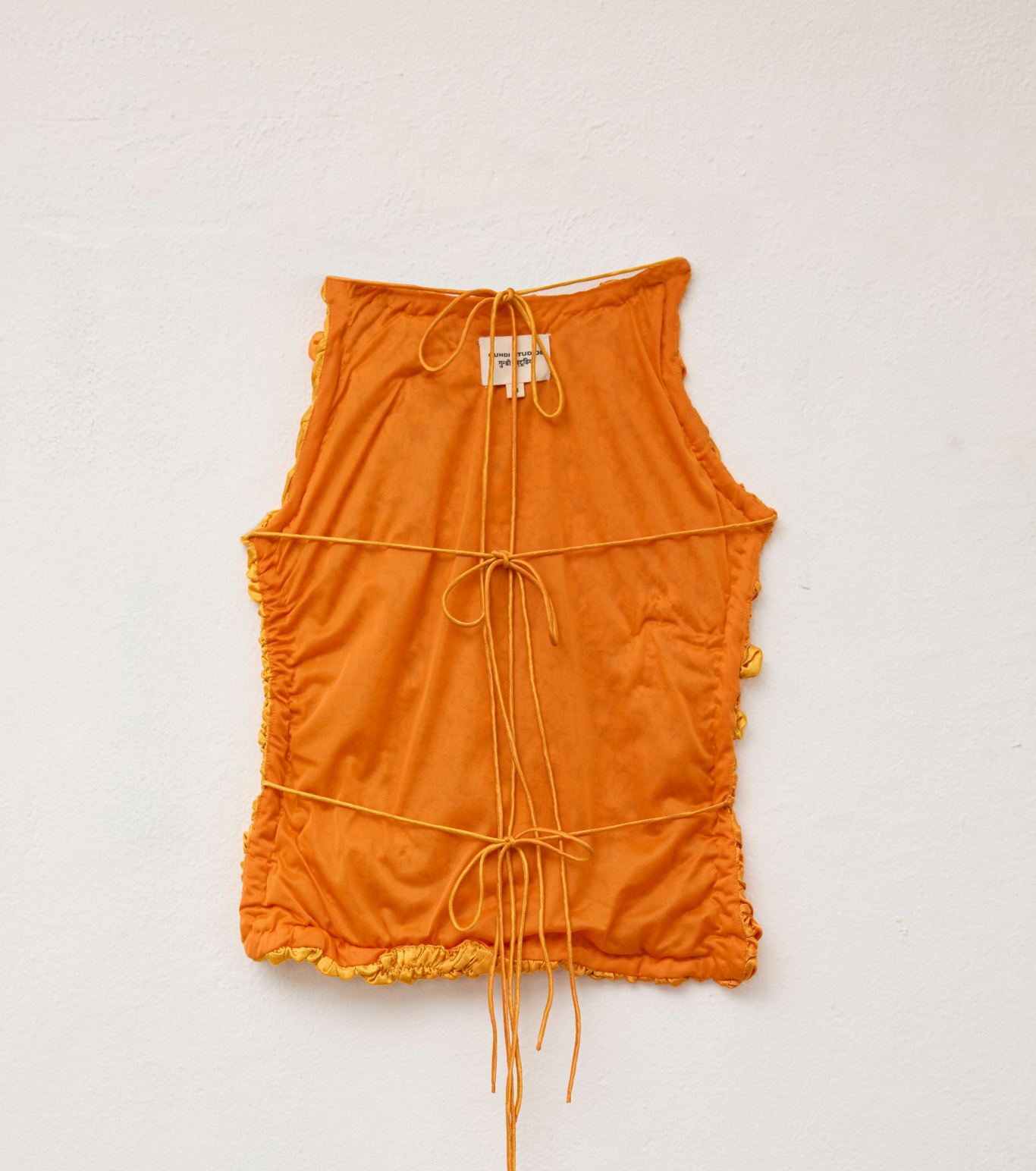 Smocked from vibrantly dyed Mashru silk, this top playfully evokes the form of Indian laddus—only with a bold, backless design. Our Mashru silk is sourced from Amurta Vankar, the only female Mashru weaver in Bhujodi, ensuring both heritage and craftsmanship in every piece.