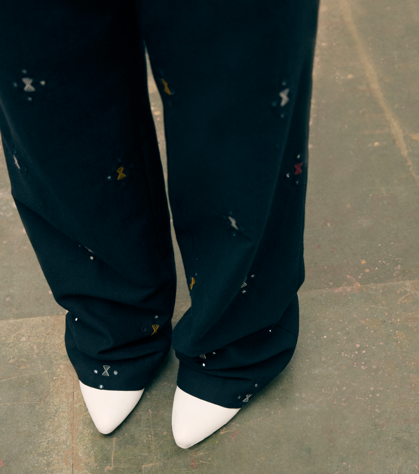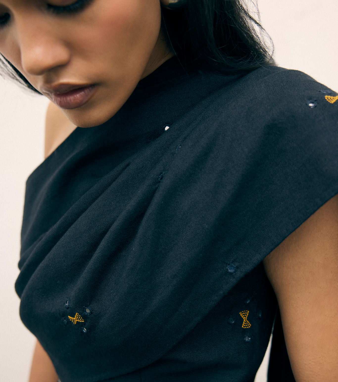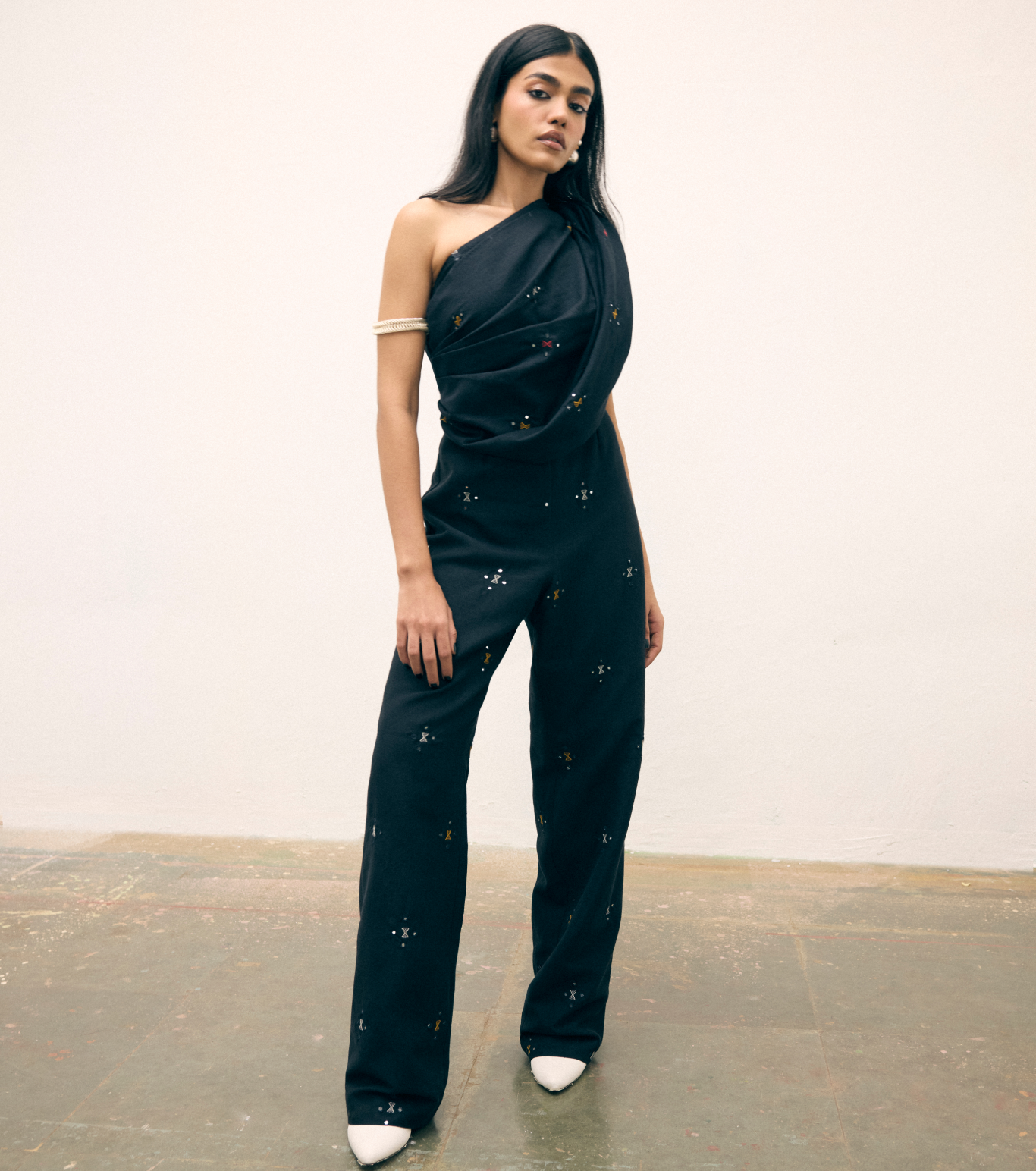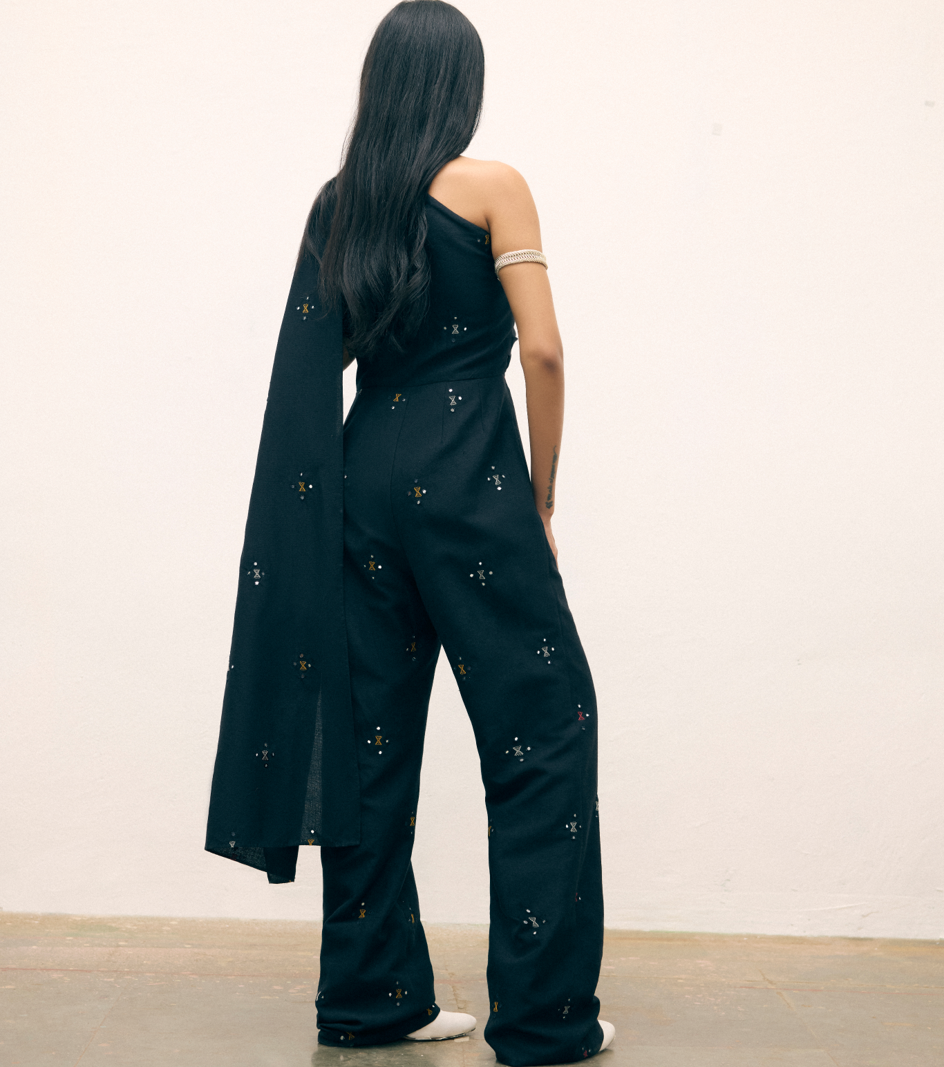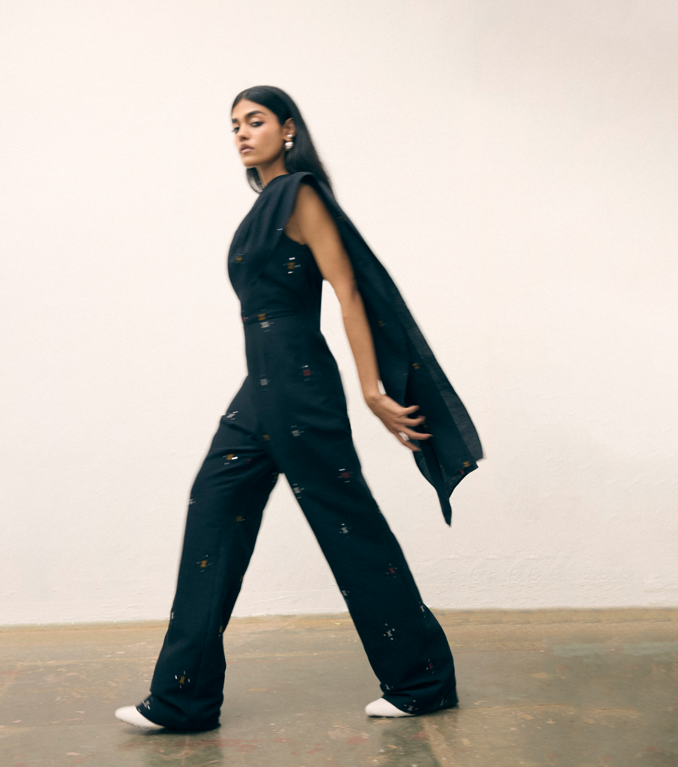 A jumpsuit that captures the graceful draping you would expect to see on a saree, while offering the ease and versatility of pant bottoms. This elegant piece features a merino wool-cotton blend, skillfully handwoven by Krishna Vankar—one of the pioneering female Kala cotton weavers of Kutch. An alumna of Somaiya Kala Vidya, a school founded by Judy Frater, Krishna brings exceptional craftsmanship to every thread. Merging artisanal heritage with contemporary workwear, this jumpsuit embodies both structure and artistry.