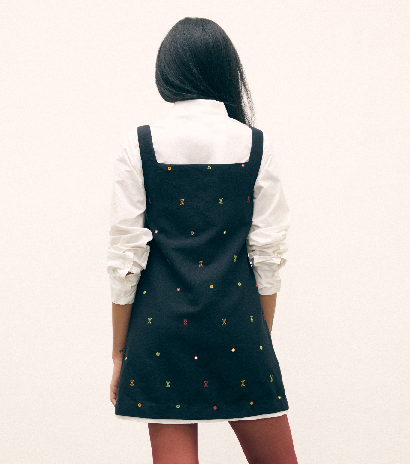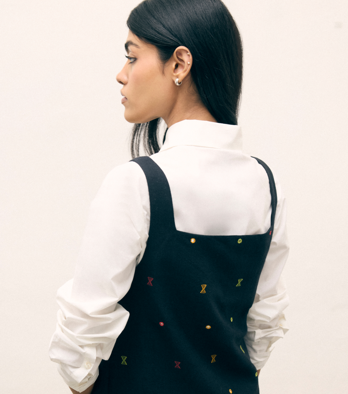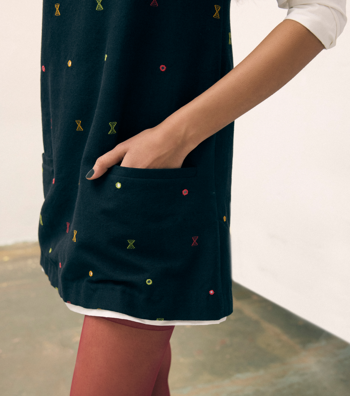 A refined tunic, inspired by classic girls' school uniforms and reimagined for modern office wear.This elegant piece features a merino wool-cotton blend, skillfully handwoven by Krishna Vankar—one of the pioneering female Kala cotton weavers of Kutch. An alumna of Somaiya Kala Vidya, a school founded by Judy Frater, Krishna brings exceptional craftsmanship to every thread. Merging artisanal heritage with contemporary workwear, this tunic embodies both structure and artistry.