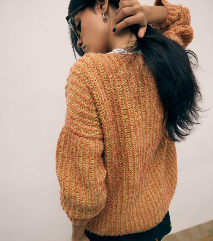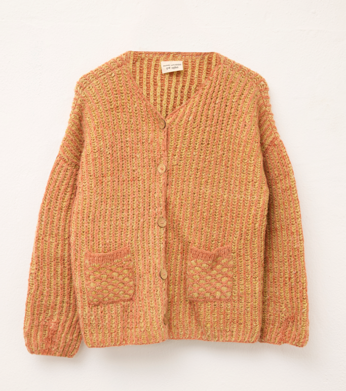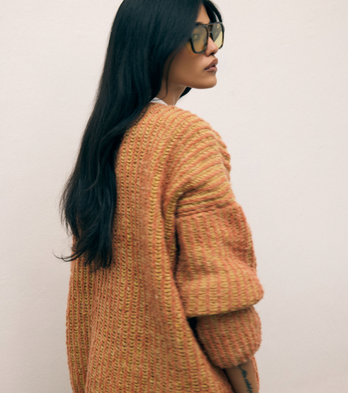 Named after the traditional Indian dessert, the laddu cardigan is a vibrant knit crafted in collaboration with Kullvi Whims. Made from indigenous desi wool and naturally dyed with madder, lac, and iron, it was developed over six months in the Himalayas. Hand-knit with care, it brings warmth, color, and tradition to everyday wear.